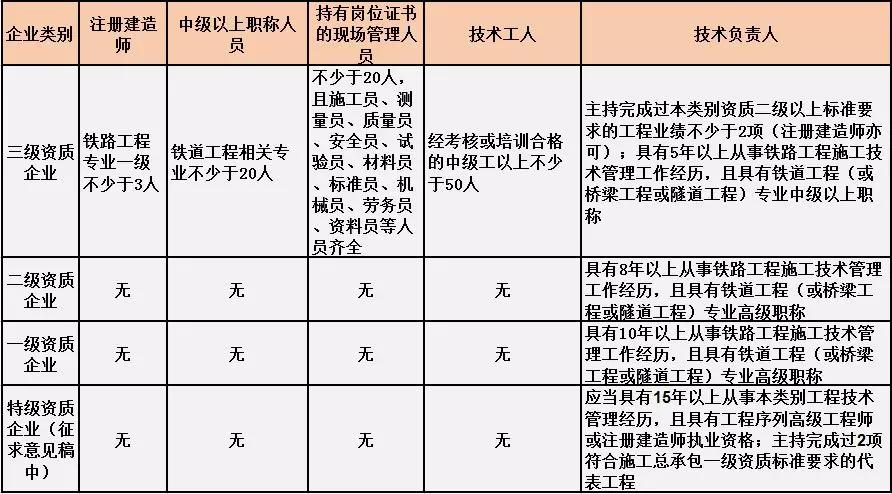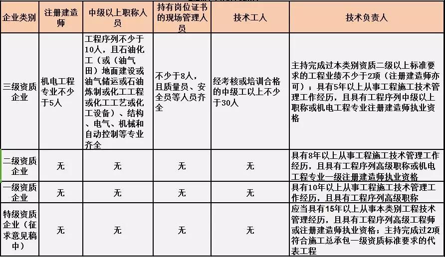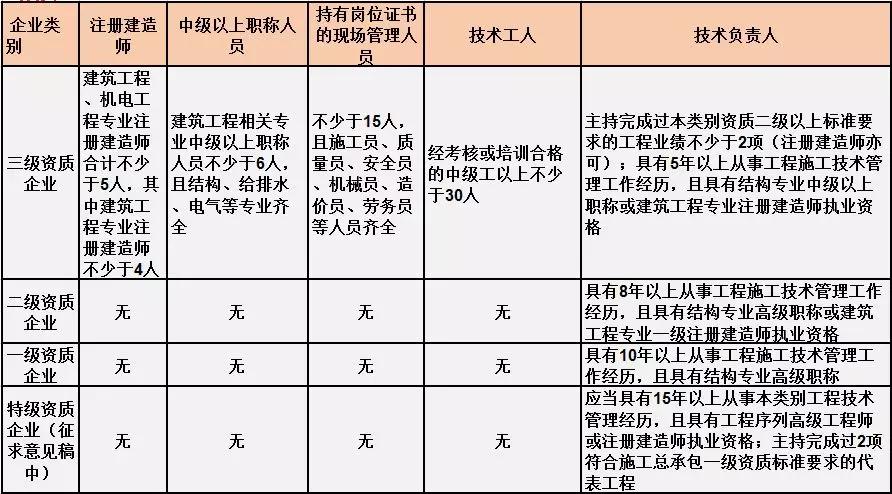 換句話說,并不是所有企業(yè)資質都不要求有建造師等企業(yè)人員。施工總承包三級資質企業(yè)對建造師等人員仍有要求,一級資質、二級資質企業(yè)保留技術負責人這一項要求,特級資質另有規(guī)定。